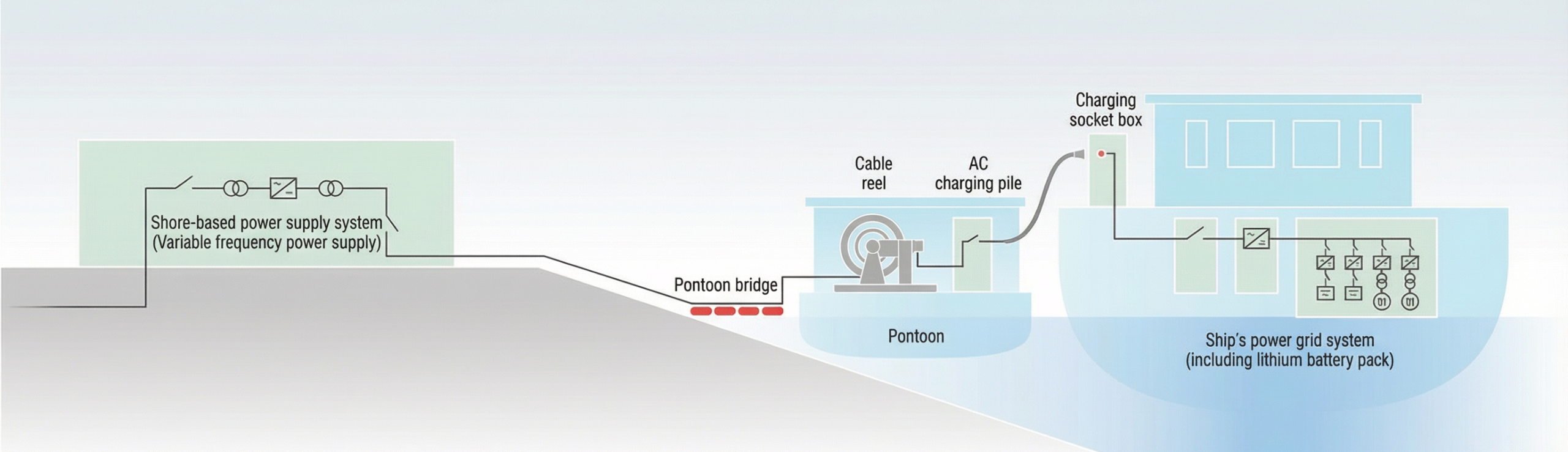 (1) Primarily for inland river scenarios, this AC charging system includes AC charging piles, landing stages, floating bridges, cable reels, and other equipment. It is ideal for areas with significant water level fluctuations and berthing points far from the shore, applicable to inland electric cargo ships and scenic spot cruise ships. The vessel must be equipped with AC/DC rectification equipment.