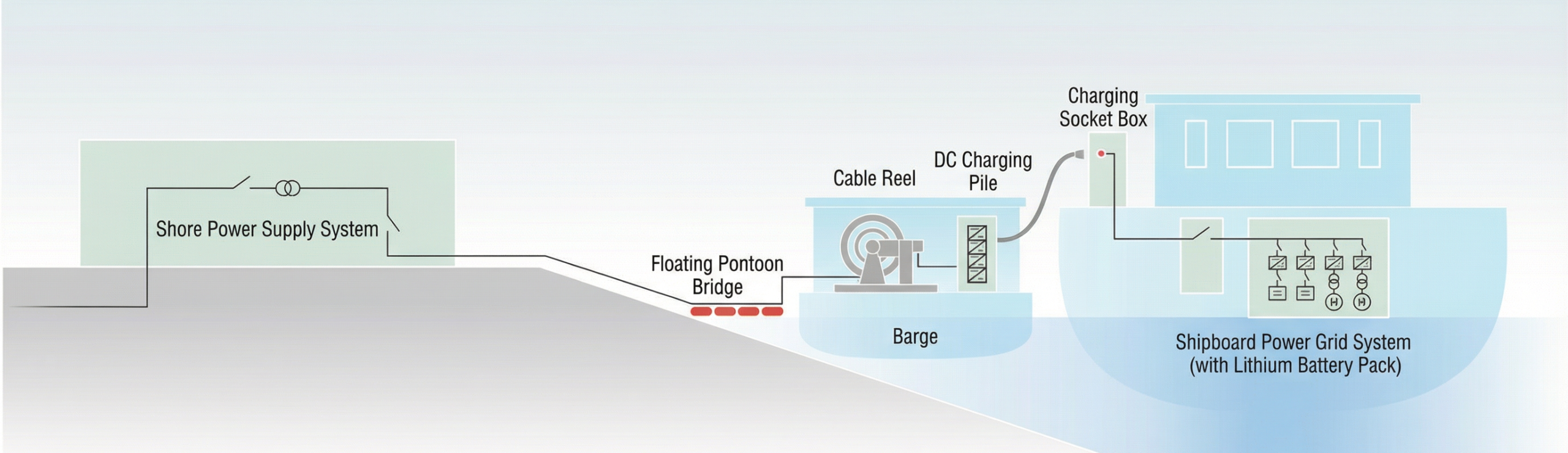 (2) Designed for inland river environments, this DC charging system comprises DC charging piles, landing stages, floating bridges, cable reels, and related devices. It suits locations with large water level drops and berthing points distant from the shore, and is applicable to inland electric cargo ships and scenic cruise vessels.