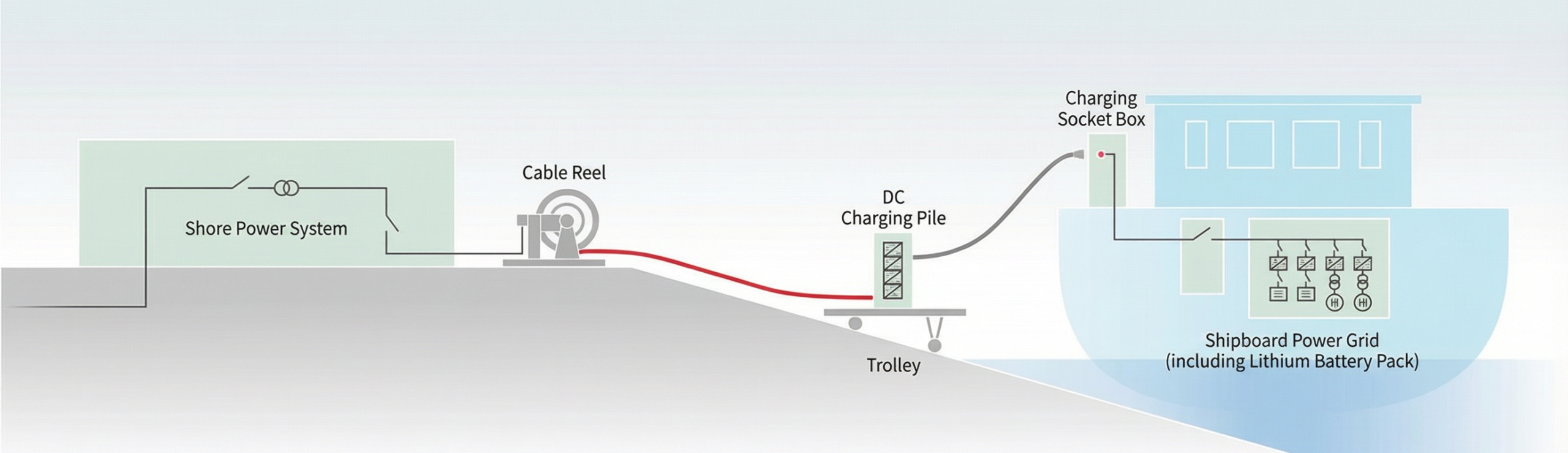 (2) For inland river applications, this DC charging system includes DC charging piles, pulleys, cable reels, and other components. It is intended for regions with large water level drops, berthing points far from the shore, and flat embankments, applicable to inland electric cargo ships and scenic spot cruise vessels.