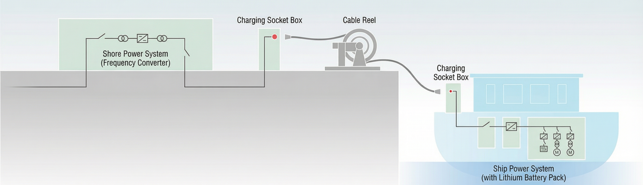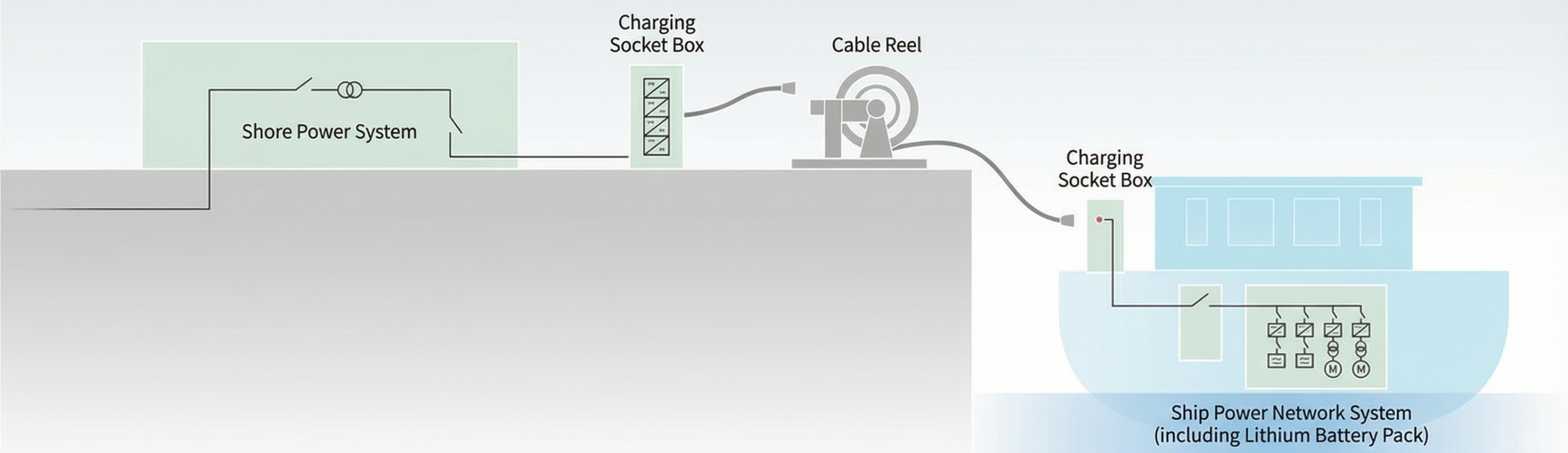 (1) This AC charging system for inland river scenarios is composed of charging socket boxes, cable reels, and other devices. It is suitable for areas with large water level fluctuations and vertical embankment berthing points (e.g., the Three Gorges Reservoir Area), and is applicable to inland electric cargo ships and scenic cruise ships. The vessel must be equipped with AC/DC equipment.